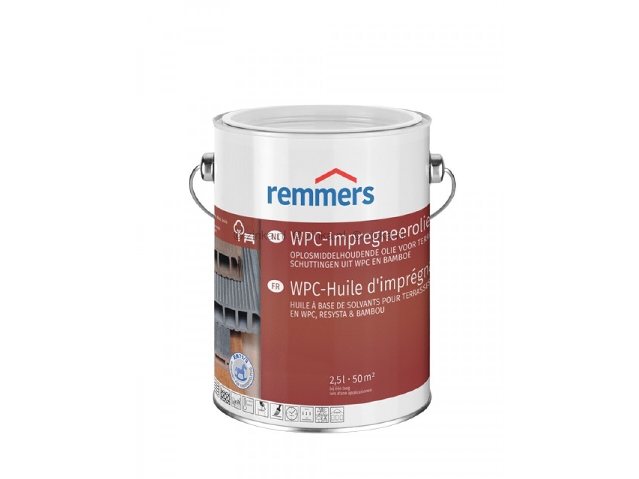 De Remmers WPC-impregneerolie is speciaal voor terrassen en schuttingen van WPC, resysta en bamboe en is geschikt voor binnen- en buitentoepassingen. De olie is niet alleen waterafstotend, maar ook olie,- vet,- en vuilwerend. Het product dient aangebracht te worden op een droge, stofvrije ondergond. Voor gebruik moet de olie goed opgeroerd worden. Daarna kunt u de WPC-impregneerolie met verfkwast, blokkwast of doek (katoen) aanbrengen. Na 4 tot 6 uur kunt u het oppervlak beoordelen en afhankelijk van het resultaat eventueel een tweede laag aanbrengen.